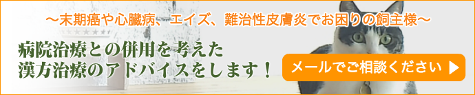 東洋医学を積極的に取り入れ、さまざまな漢方薬を組み合わせることによって、大変よい結果がでましたので、ここに当ホームページを開き、癌や腫瘍、白血病・猫エイズ・伝染性腹膜炎などの免疫系の病気や、難治性皮膚炎やアカラス、脱毛・湿疹などの皮膚病、また心臓肥大や心臓弁膜症などの循環器系疾患など、難病治療を専門として、西洋医学と東洋医学の融合によるまったく、新しいペットの難病治療を提案しています。